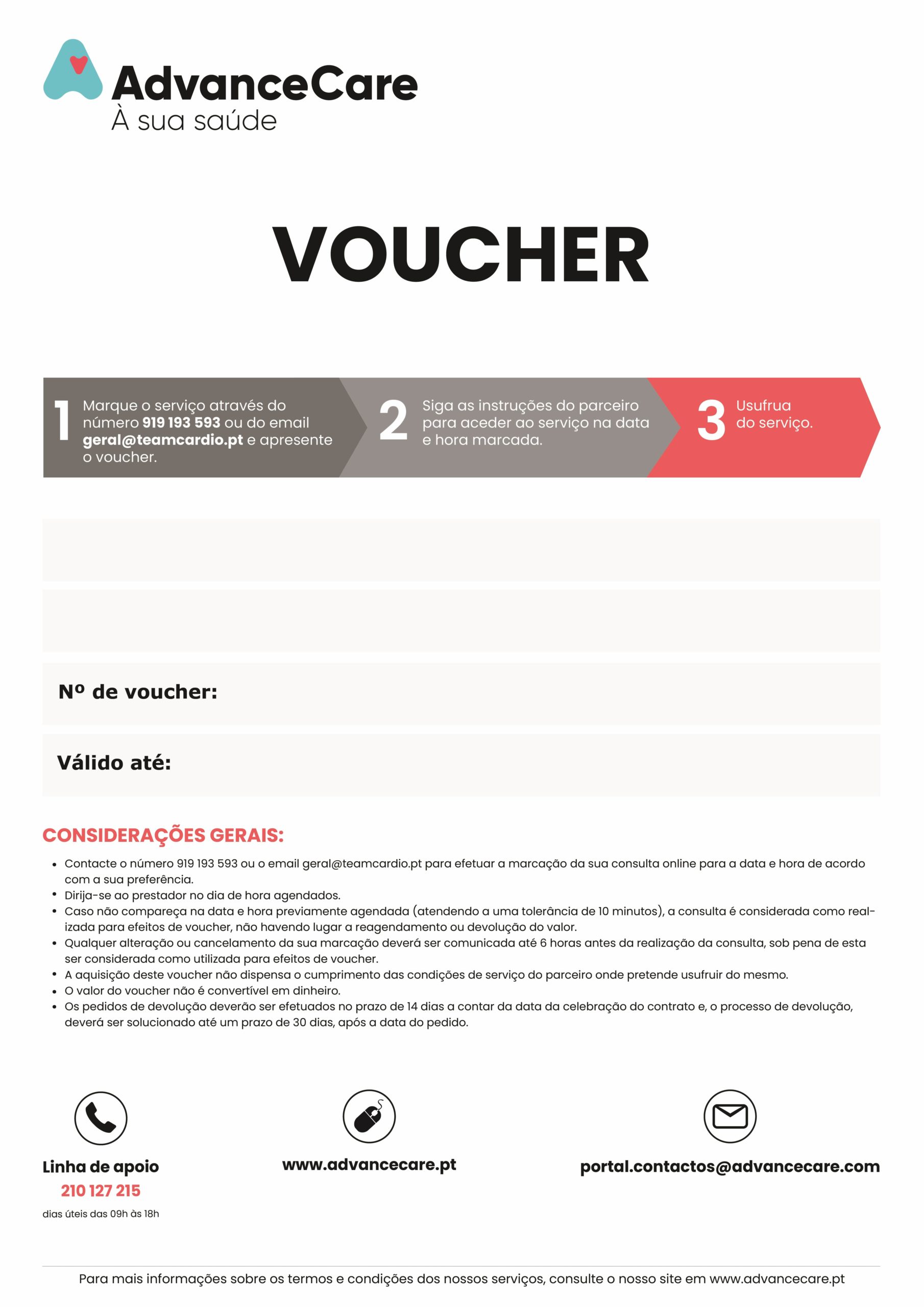 • Para marcações ou esclarecimentos adicionais: geral@teamcardio.pt ou 919 193 593. Apresente o número do seu voucher.